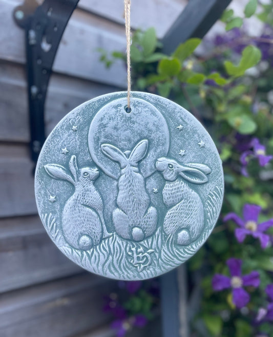 Moon Gazing Hares Terracotta Hanging Garden Wall Plaque Bronze or Silver