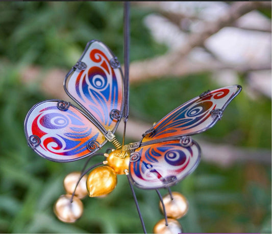 Beautiful Gold Butterfly Bobbin Bells Wind chime, Detailed Colourful Glass Wings