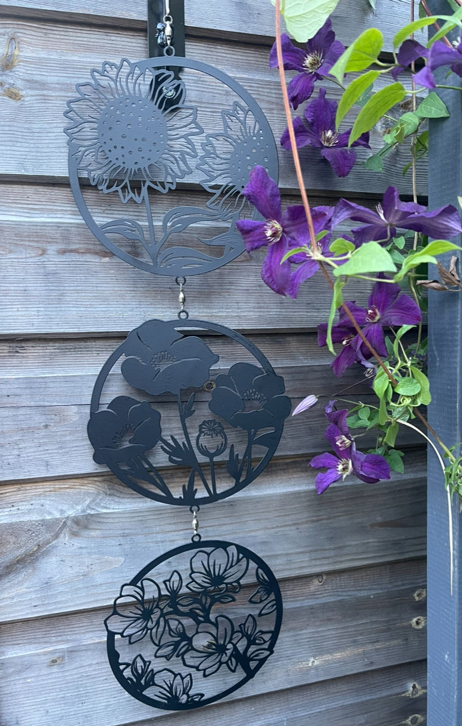 Beautiful metal silhouette Triple orbit wind spinner with eye catching floral designs. These spinners are total eye catchers when spinning in the breeze.