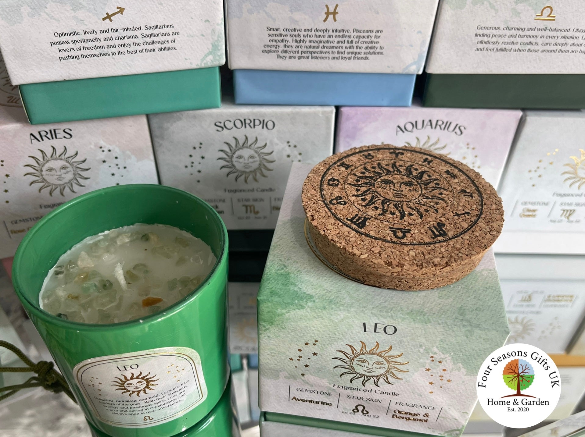 Each candle features a sprinkling of crystal chips to help amplify the best qualities of each star sign and promote positivity.