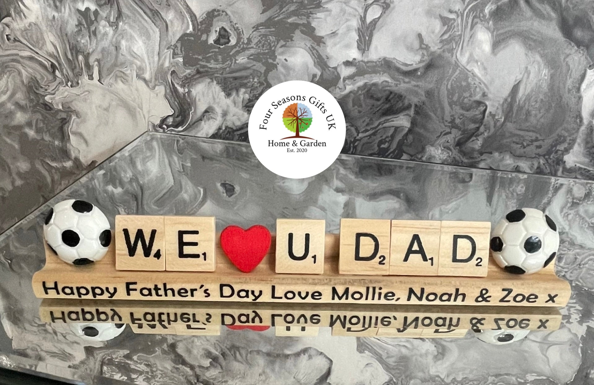 Handmade wooden Personalised Scrabble letter holder with ‘We Love u Dad’ & optional personalised message, ideal gift for Father’s Day or birthdays and would make a lovely keepsake gift.