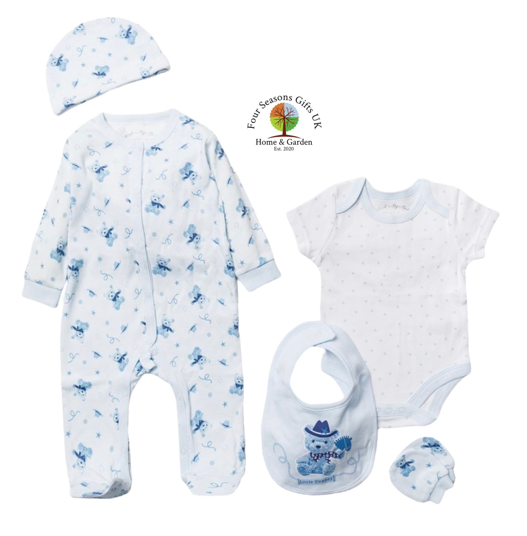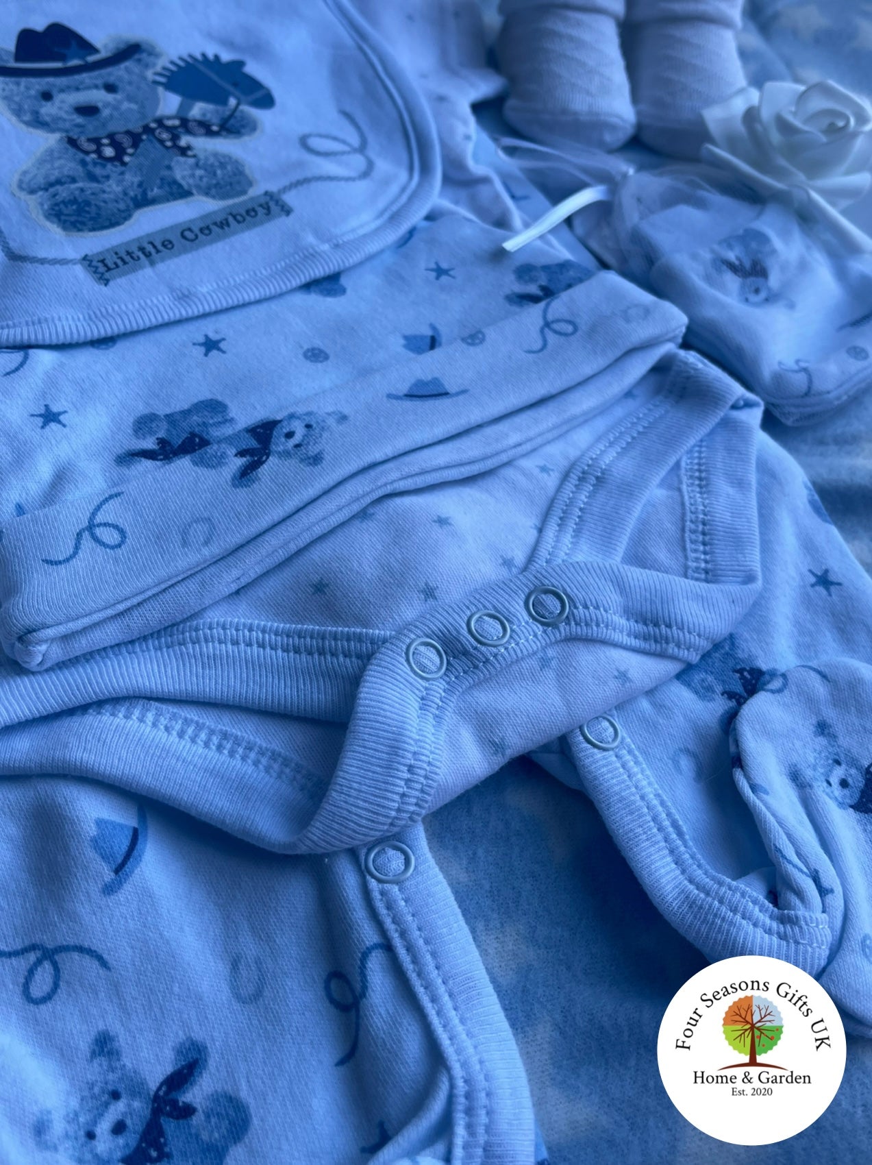 The NEW Memory Box 7 Piece Baby Boys cute Cowboy Bear Gift Set from FOUR SEASONS GIFTS UK is a charming collection designed specifically for baby boys.
