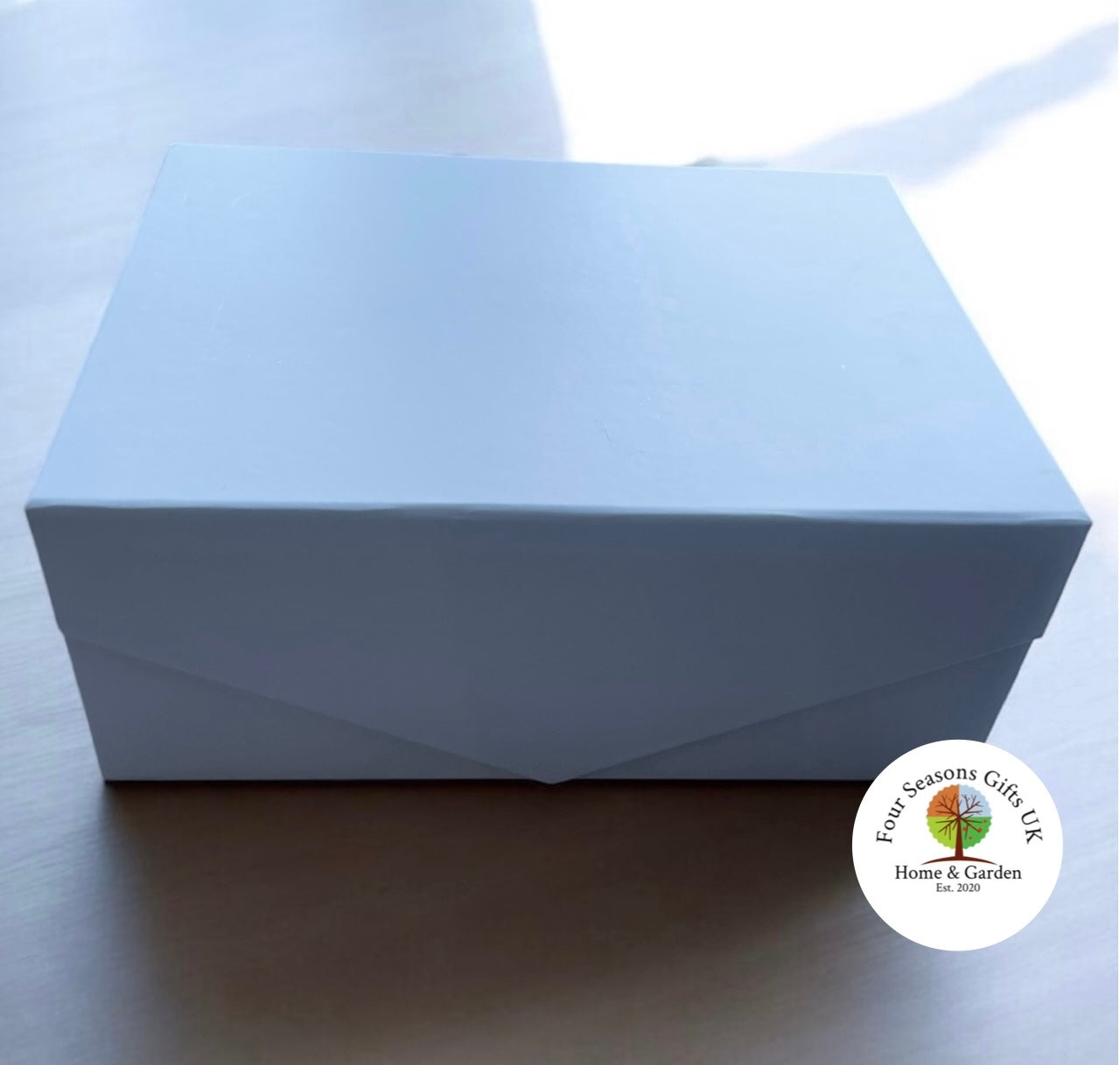This set includes a variety of items in a baby blue colour such as matching sleep-suit, vest, Hat, Mittens, Bib, Socks in size Newborn and a cute bear rattle toy all presented in a white gift box which can double as memory box for baby. Memory box has a magnetic closure.