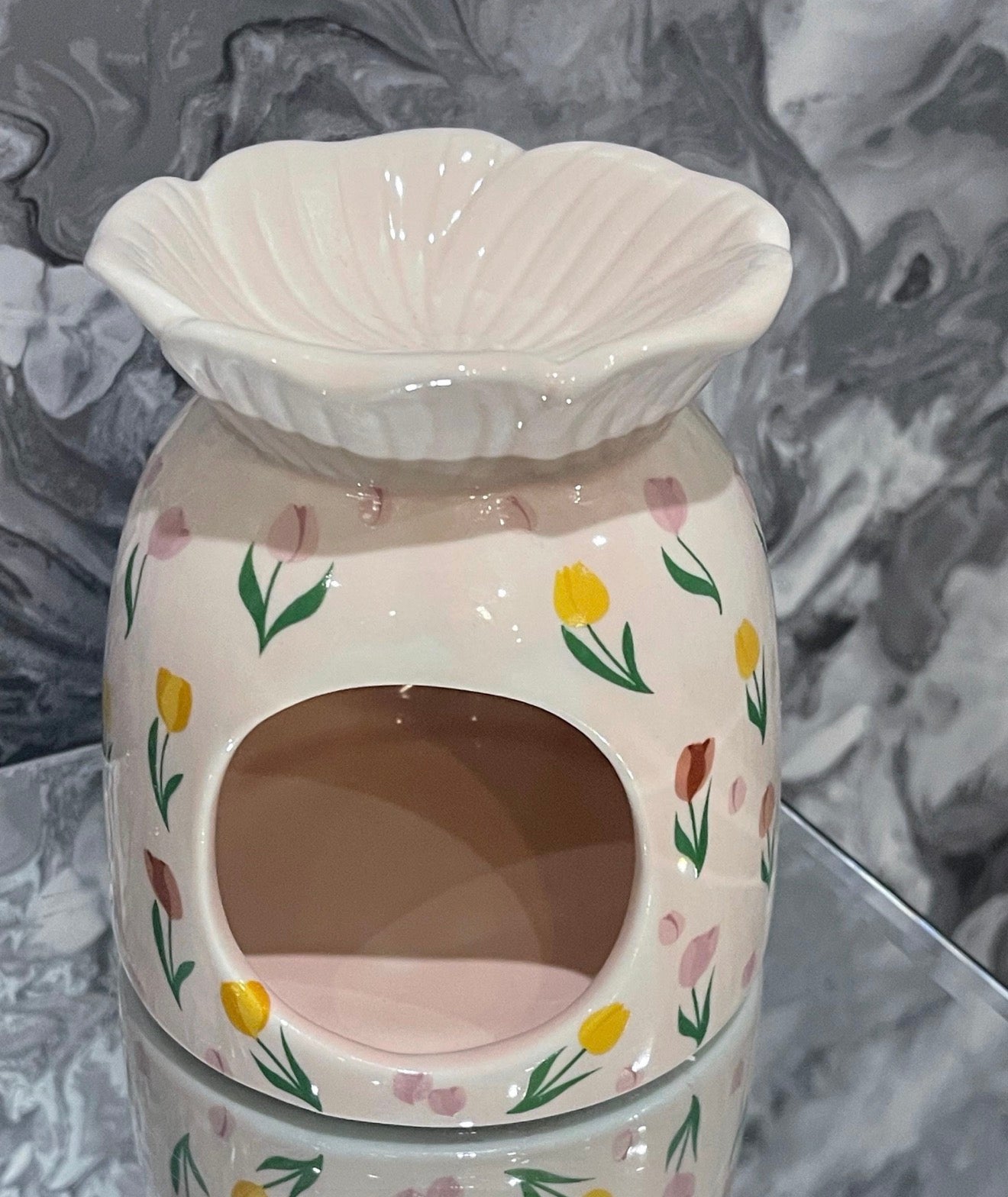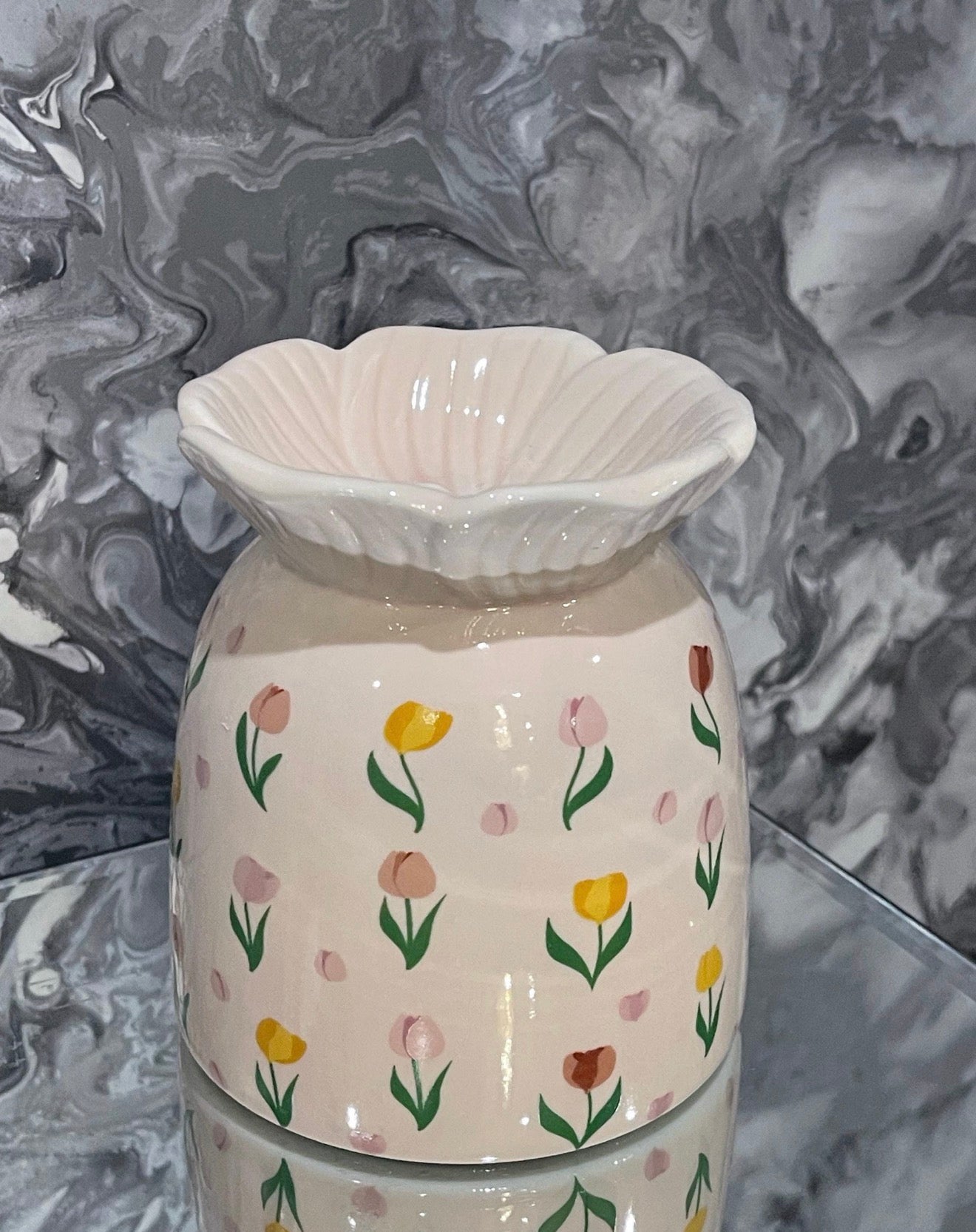 A beautiful pastel tulip-themed ceramic oil burner, perfect for spring decor, home fragrance lovers & thoughtful gifts.